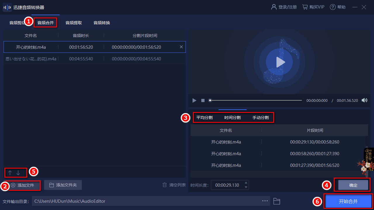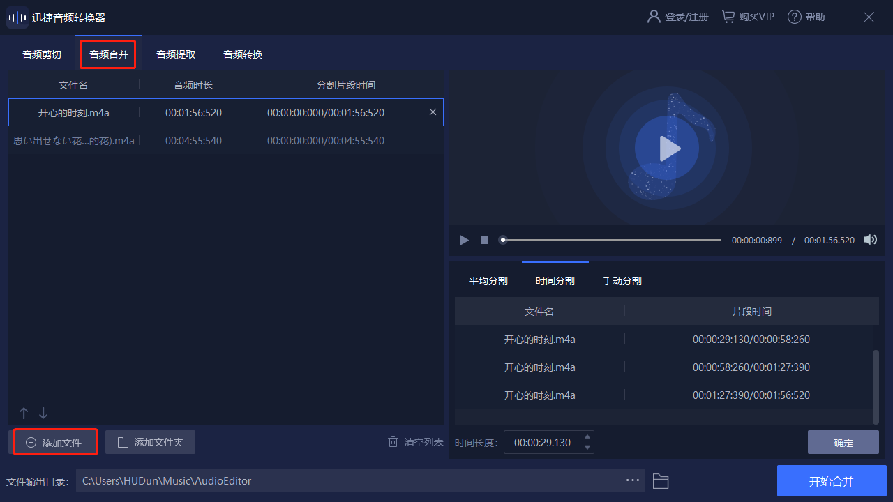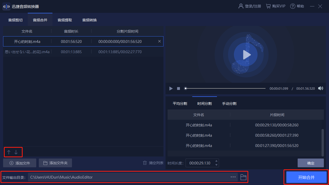 在將音樂添加到軟件并且完成剪輯以后,我們可以根據(jù)自己的需要調(diào)整音樂的前后位置,然后選擇【文件輸出目錄】后點(diǎn)擊【開始合并】即可。