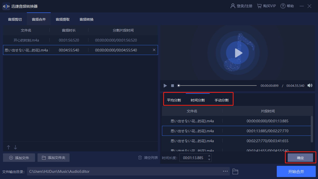 多種音頻剪切方式支持平均分割、時(shí)間分割、手動(dòng)分割