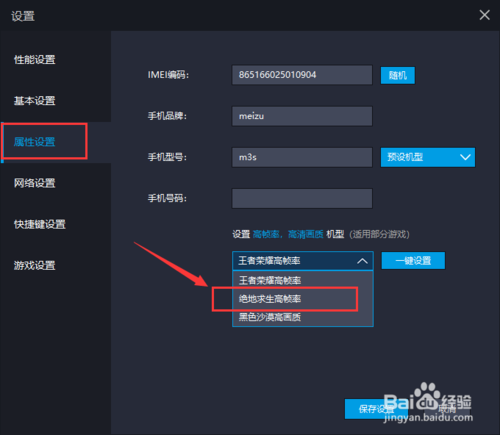 接著是屬性設(shè)置,找到設(shè)置高幀率的地方,選擇絕地求生,然后點(diǎn)擊右邊的一鍵設(shè)置,一定要一鍵設(shè)置,不然也是保存不到的;手機(jī)型號預(yù)設(shè)機(jī)型是xiaomi6,然后保存設(shè)置。