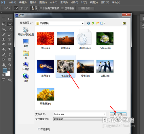 首先打開ps,在軟件的左上角打開文件,然后選擇打開,在資源管理器中打開你要處理的圖片,選擇之后按打開按鈕即可加載到軟件中。