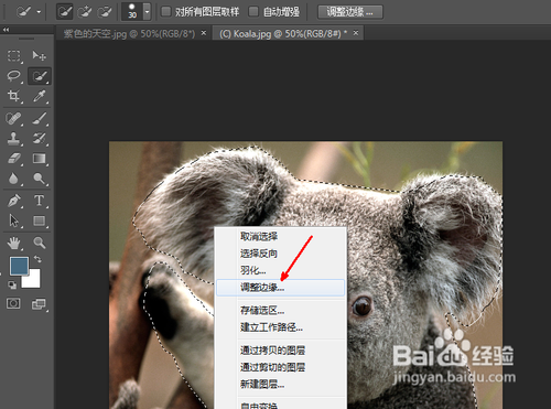 選定之后我們還要調整一個摳圖的邊緣,因為有時候摳得痕跡很明顯,所們要對其處理一下才顯得自然。點擊右鍵,然后選擇調整邊緣選項。