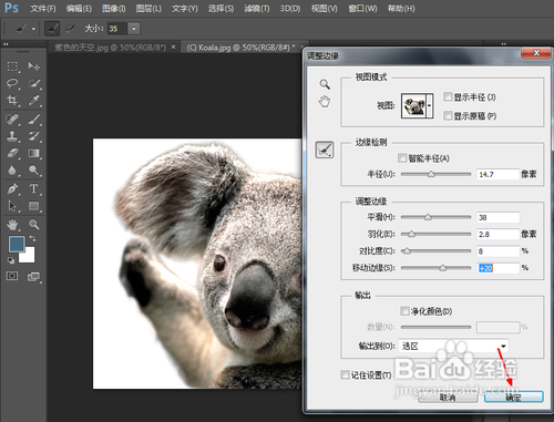 在調整邊緣選項中,有一系列的選項可以讓你自定義設置。比如平滑邊緣或者羽化等設置,左右調動這些滑塊 ,直到你認為滿意,然后點擊確定。
