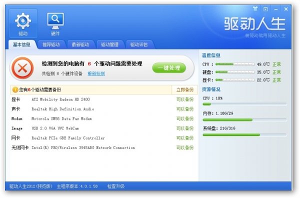 驅(qū)動人生2012是一款免費的驅(qū)動管理軟件,實現(xiàn)智能檢測硬件并自動查找安裝驅(qū)動,為用戶提供最新驅(qū)動更新,本機驅(qū)動備份、還原和卸載等功能。軟件界面清晰,操作簡單,設(shè)置人性化等優(yōu)點,大大方便廣大機友管理自己的電腦的驅(qū)動程序