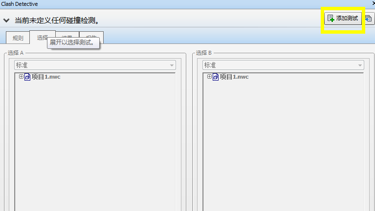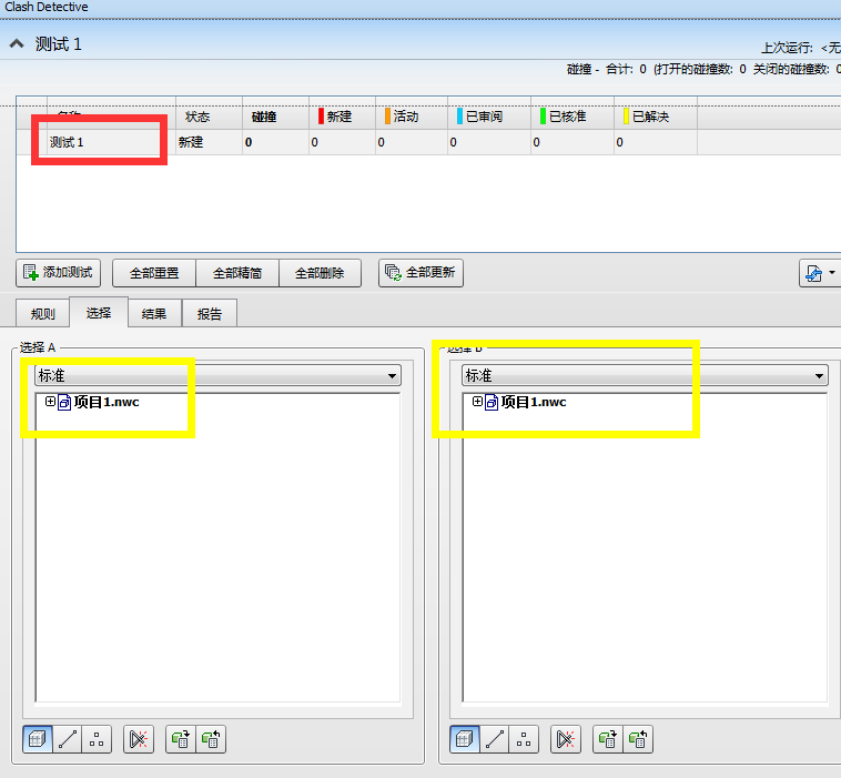 右上方點(diǎn)擊添加測試,然后紅色區(qū)域?yàn)閷τ诟捻?xiàng)目碰撞測試進(jìn)行重命名,例如此次檢討墻與管的碰撞個(gè)數(shù)