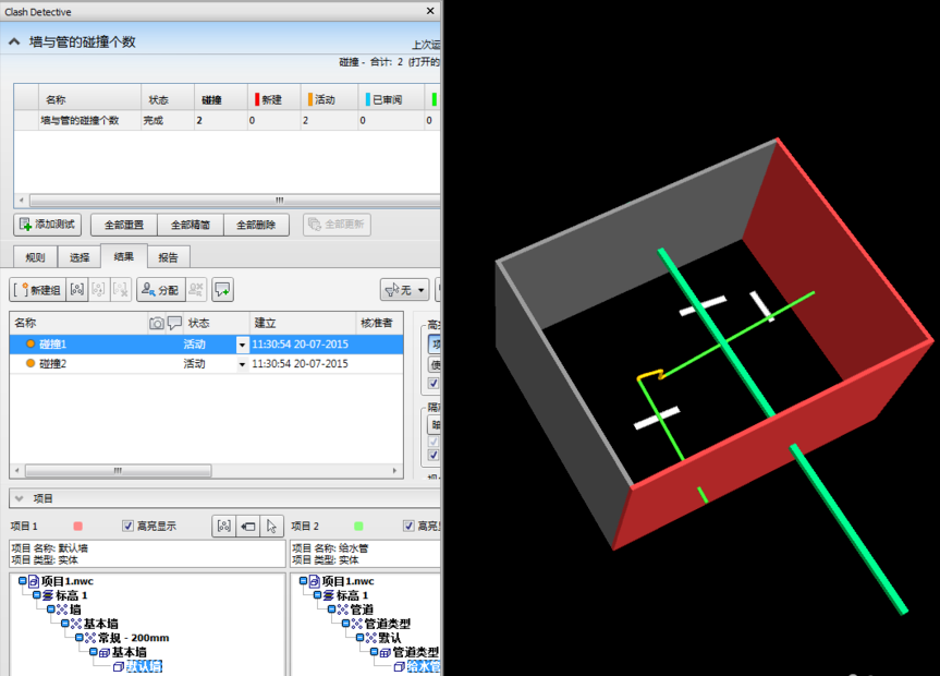 在選擇中分別選擇要碰撞的類型,例如左側(cè)為墻,右側(cè)為管道管件構(gòu)件,然后點(diǎn)擊下方的運(yùn)行測試