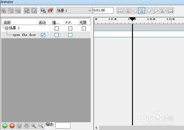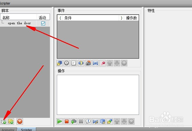 然后選擇Scripter命令,會彈出如下對話框,選擇對話框左下角的添加新腳本命令,添加一個(gè)新的腳本open the door,如圖所示。