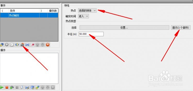 然后點(diǎn)擊觸發(fā),對彈出特性的對話框進(jìn)行如下設(shè)置(半徑可以自行設(shè)置想要的值),如圖所示。