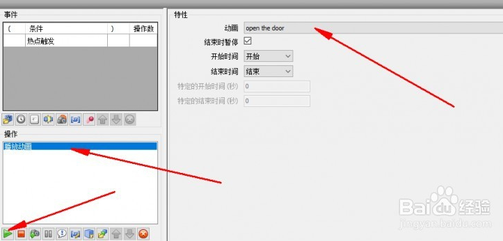隨后,設(shè)置播放動畫,在特性的對話框添加open the door動畫,如圖所示。