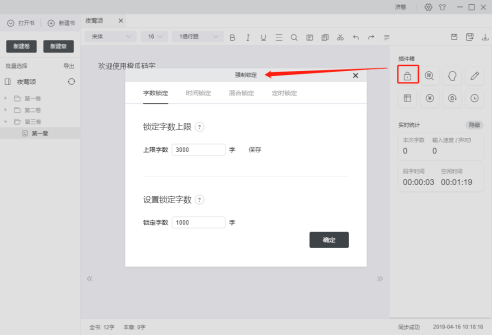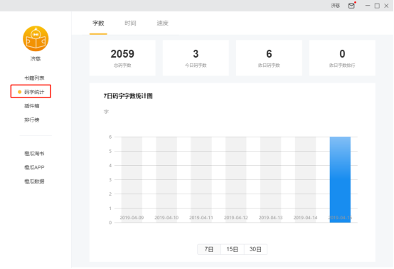 4. 數(shù)字4為碼字統(tǒng)計按鈕,點(diǎn)擊切換到碼字統(tǒng)計頁面,此頁面包含當(dāng)前用戶碼字字?jǐn)?shù)/碼字時長/碼字速度等數(shù)據(jù);