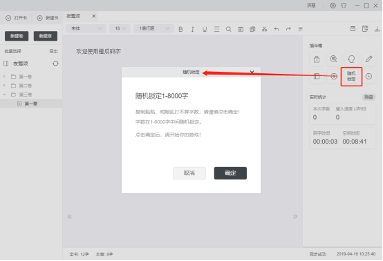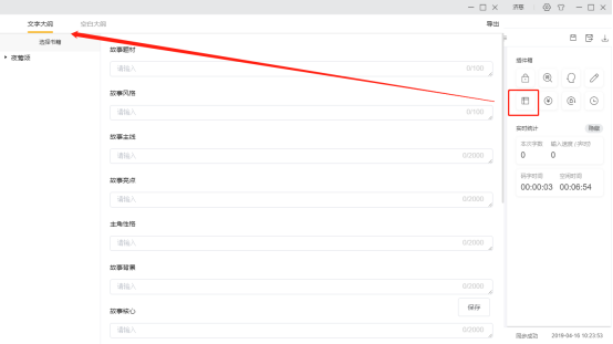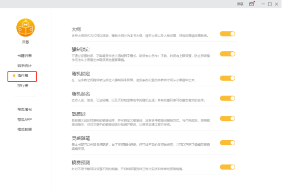 5. 數(shù)字5為插件箱按鈕,點(diǎn)擊切換到插件箱頁面,插件箱是一系列碼字工具的集合,目前包括寫作大綱,強(qiáng)制鎖定,隨機(jī)鎖定,隨機(jī)起名,敏感詞檢索,靈感隨筆,稿費(fèi)預(yù)測等;
