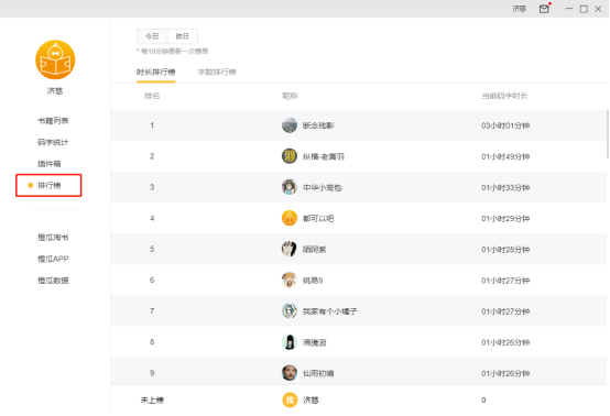 6. 數(shù)字6為排行榜按鈕,點(diǎn)擊切換到排行榜頁面,排行榜頁面包含橙瓜碼字所有用戶今日/昨日碼字總字?jǐn)?shù)排行前50名,碼字總時長前50名;