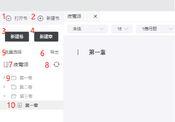 9. 數(shù)字9為目錄卷,左鍵單擊可展開卷下章節(jié)。右鍵單擊可彈出操作對話框,包含創(chuàng)建新卷,創(chuàng)建新章,重命名,刪除本本卷,打開本地文件夾;