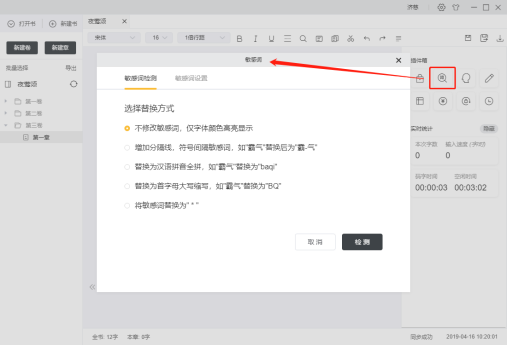 33. 數(shù)字33為敏感詞檢索,點(diǎn)擊進(jìn)入敏感詞頁面,可選擇敏感詞替換方式,如高亮顯示,增加分隔線,并可自定義添加敏感詞;
