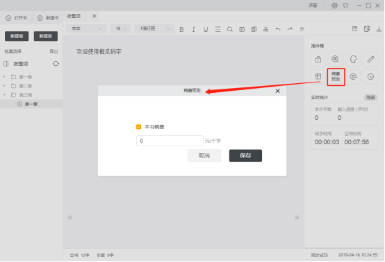 37. 數(shù)字37為稿費(fèi)預(yù)測按鈕,點(diǎn)擊可進(jìn)行當(dāng)前書籍稿費(fèi)設(shè)置,設(shè)置后稿費(fèi)會實(shí)時展示在右邊欄;