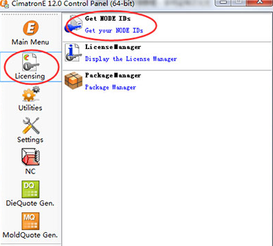 10、在開(kāi)始菜單打開(kāi)CimatronE 12.0 (64-bit)《Cimatron E 12.0 控制面板 (64-bit),選擇Licensing項(xiàng),點(diǎn)擊“Get NODE IDs”