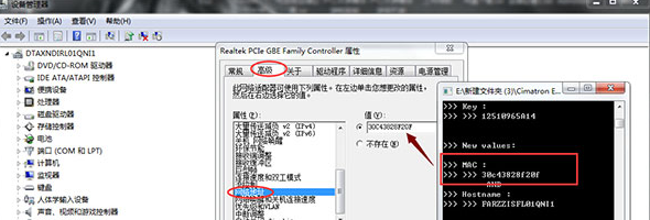 13、右鍵點(diǎn)擊計(jì)算機(jī),設(shè)備管理器》網(wǎng)絡(luò)適配器》雙擊網(wǎng)卡》高級(jí),找到網(wǎng)絡(luò)地址,將其值改為破解工具中“MAC”項(xiàng)目中的內(nèi)容