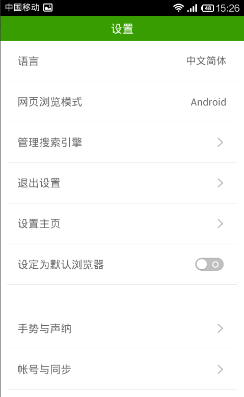 點擊“設置”后,我們可以進行“網(wǎng)頁瀏覽模式”、“賬號”等常規(guī)設置,還可以備份和還原你的瀏覽器數(shù)據(jù)。