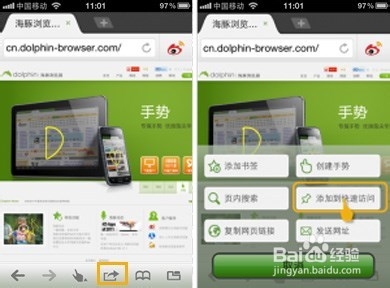 2. 使用海豚瀏覽器瀏覽任何網(wǎng)頁,點擊屏幕下方“菜單欄”第4個分享按鈕,在彈出窗口中選擇“添加到快速訪問”,即可將此網(wǎng)頁添加到快速訪問;