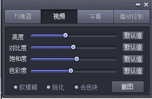 5、視頻按鈕下面,包含有影片的亮度,對(duì)比度,飽和度,色彩度,還有銳化,模糊,截圖等控制。