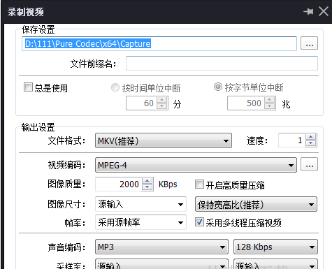 4、點(diǎn)擊“錄制視頻”后會(huì)彈出一個(gè)窗口,在這個(gè)窗口中我們可以設(shè)置錄制視頻的保存位置、輸出格式等信息,如下圖所示: