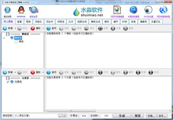 水淼文章組合工具集核心功能是,編寫模板,模板中引用元素,任意位置引用任意個元素。元素可以是文本分塊調(diào)用,可以是隨機(jī)漢字、數(shù)字、字母,或編號序列、隨機(jī)數(shù)值、隨機(jī)時間。全自由原創(chuàng)組合模式。查看原理>>當(dāng)前被選定顯示的模板即為生成使用的模板,如果選定的是模板庫,庫下的模板將隨機(jī)用于生成,而所有打勾元素庫都能被模板調(diào)用。打勾多個元素庫時,不同元素庫下的元素不能出現(xiàn)重名,否則只有第一個打勾元素庫的該重名元素能被調(diào)用。