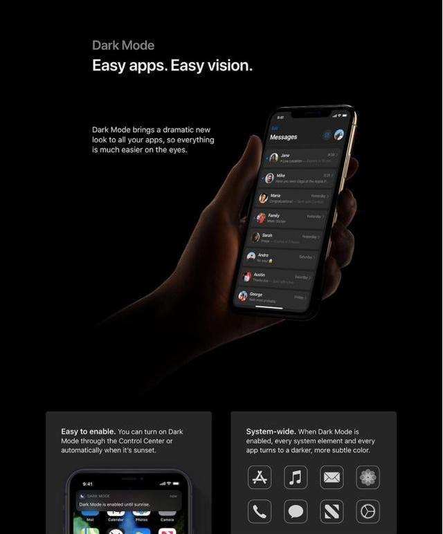 對于ios13系統(tǒng)來說,我們在蘋果公司對外的宣傳圖片來看:我們會發(fā)現(xiàn),該宣傳圖片隱隱約約預(yù)示著暗黑模式的加入,其實,早在之前的MacOS系統(tǒng)中就已經(jīng)率先加入了該模式,只不過,對于大部分iPhone用戶而言,MacOS雖然酷炫,但也只能光看著,所以,很多人都在期待著這一功能的到來。