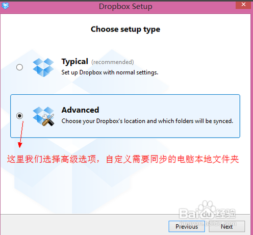 選擇了空間以后,接下來選擇 Dropbox 在本地電腦端同步的文件夾,這里我們選擇“Advanced”,如下圖所示