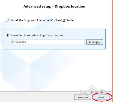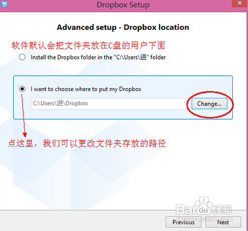 這里有二個(gè)選項(xiàng),一個(gè)是軟件默認(rèn)的安裝同步文件夾的位置,是在 C 盤下用戶目錄中。另一個(gè)是我們可以自定義的路徑,如其它盤 D、E、盤都可以。我們點(diǎn)擊“Change”,如下圖所示