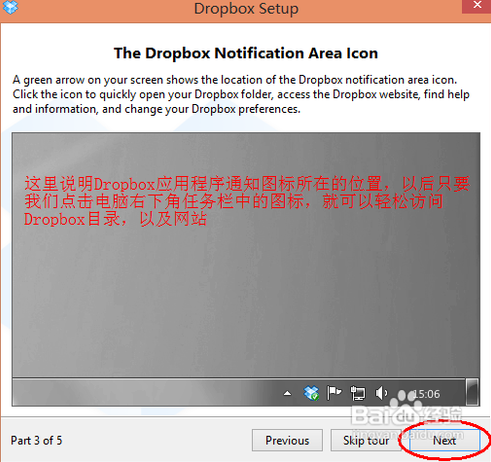 Dropbox 的程序通知圖標(biāo)會(huì)出現(xiàn)在系統(tǒng)右下角的任務(wù)欄中,雙擊這個(gè)圖標(biāo)就會(huì)直接打開 Dropbox 在電腦本地的目錄。點(diǎn)擊“Next”,繼續(xù),如下圖所示