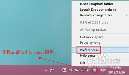 我們用鼠標(biāo)右鍵點(diǎn)擊系統(tǒng)右下角任務(wù)欄中的 Dropbox 圖標(biāo),然后選擇“Preferences”,如下圖所示
