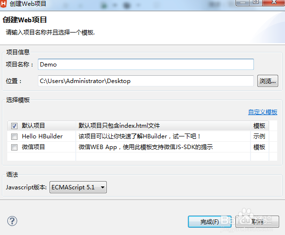 視覺設(shè)置完成之后進(jìn)入我們的項(xiàng)目建立階段,點(diǎn)擊“新建WEB項(xiàng)目”,創(chuàng)建項(xiàng)目名稱,設(shè)置項(xiàng)目所在的位置確定即可,完成之后會(huì)在左邊的項(xiàng)目欄管理器中出現(xiàn)。我這里創(chuàng)建的名稱為demo。