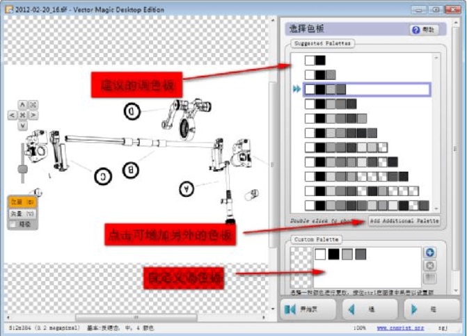 *如果選擇了(1)或(3)時,程序會直接進行矢量化過程。但如果選擇了自定義顏色,則程序會進入下一步“選擇色板”,讓用戶指定、編輯顏色。