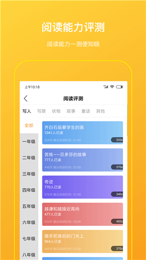 1、閱讀能力測評定期閱讀能力值測評,從五大維度檢測學(xué)生的閱讀能力和提升狀況,全方位量化孩子的閱讀能力,更有針對性地幫助孩子制定閱讀計劃。