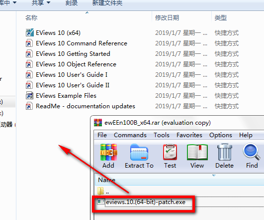 1、首先我們需要找到下載軟件包中的 “eviews.10.(64-bit)-patch.exe” 程序,將其復(fù)制粘貼到你設(shè)置EViews的安裝目錄中。如下:
