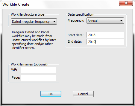 2、開始創(chuàng)建后進(jìn)入到EViews的Wordkfile工作文件設(shè)置界面,我們選擇在 “start date” 處輸入起始時(shí)間,“End date” 處輸入截止時(shí)間。如下: