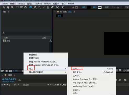 3.在項目面板雙擊雙擊就會出現(xiàn)“文件”,再點擊“導(dǎo)入”、“文件”;