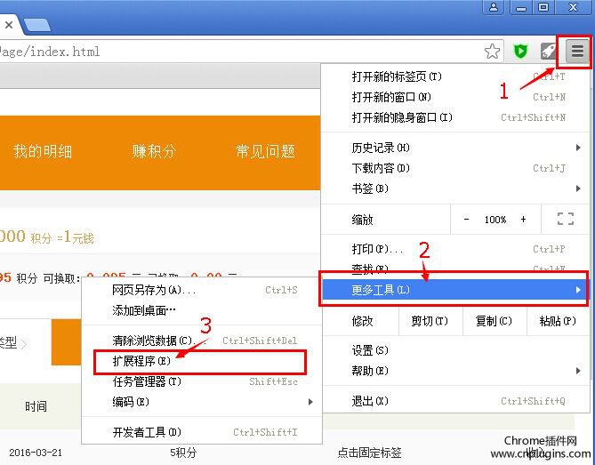 第二步:安裝好chrome瀏覽器后,按照如下圖示的順序操作(菜單欄--自定義--更多工具--擴(kuò)展程序)