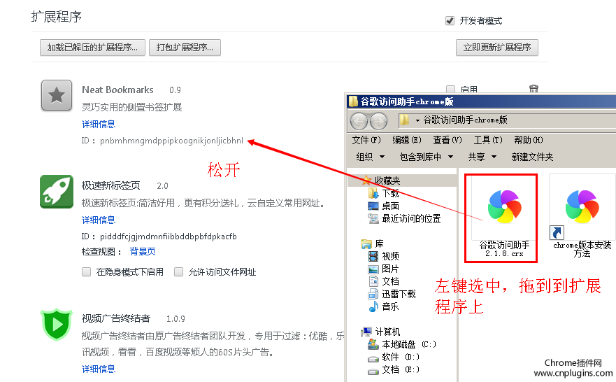 第二步,解壓下載包,選中crx文件,拖動(dòng)到擴(kuò)展程序中,松開(kāi)