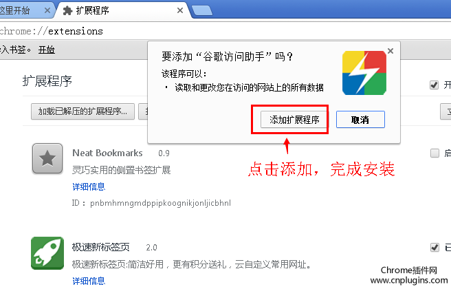 第四步:點(diǎn)擊添加谷歌訪問(wèn)助手拓展程序,確定完成安裝