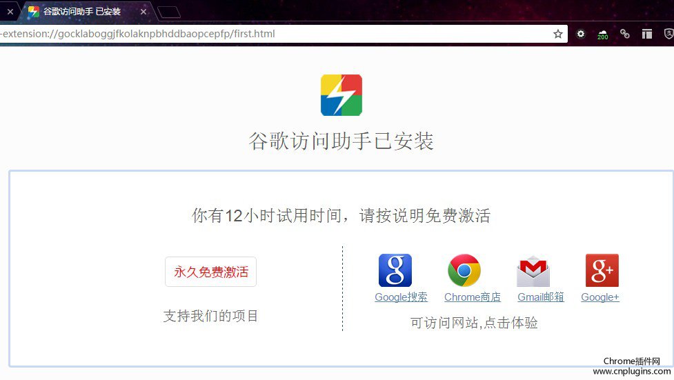 第五步:安裝成功后,瀏覽器頁(yè)面會(huì)出現(xiàn)如下提示信息,用戶有12個(gè)小時(shí)的免費(fèi)試用時(shí)間。實(shí)話,小編在沒(méi)有點(diǎn)擊激活谷歌訪問(wèn)助手前,按照?qǐng)D示提示信息使用點(diǎn)擊chrome商店和google都無(wú)法打開(kāi)。