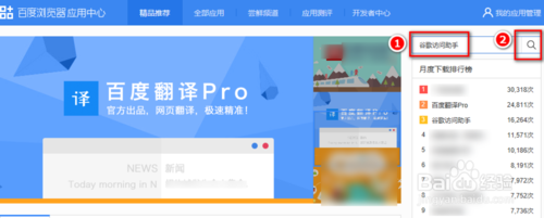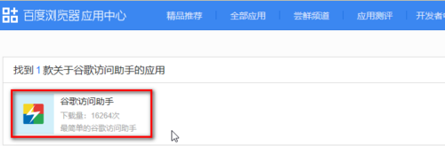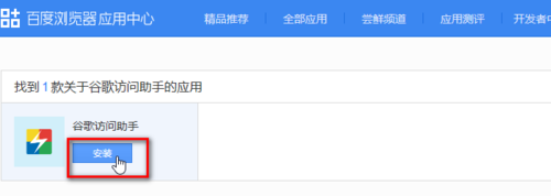 在搜索框中輸入“谷歌訪問(wèn)助手”后,點(diǎn)擊搜索按鈕。如果需要安裝核心組件才能使用百度瀏覽器應(yīng)用中心應(yīng)用,就請(qǐng)點(diǎn)擊相應(yīng)按鈕安裝好組件,再來(lái)操作。