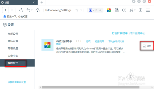 如果訪問(wèn)出現(xiàn)問(wèn)題,請(qǐng)去瀏覽器設(shè)置中心“我的應(yīng)用”下確認(rèn)是否以及啟用了谷歌訪問(wèn)助手。