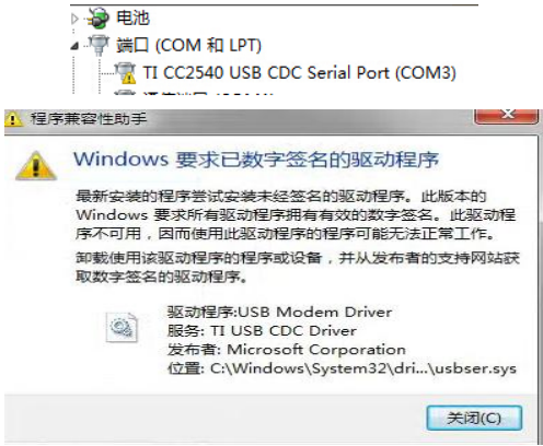 更新驅動時,右鍵 “計算機/我的電腦-----管理----設備管理器----端口(戒者其他設備)---TICC2540 USB CDC Serial Port (com3)”更新驅動程序軟件,出現(xiàn)如下截圖,需要禁用數(shù)字簽名。