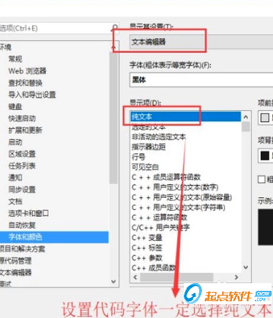 將顯示其設(shè)置選中為“文本編輯器”,并在下方“顯示項(xiàng)”列表中選中“純文本”。之就可以根據(jù)需要來(lái)選擇字體、文字顏色、背景顏色了。