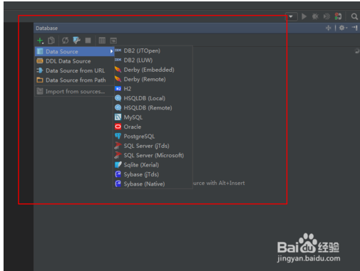 2.點擊Databases在左邊出現(xiàn)功能窗口,鼠標(biāo)點擊加號,會看有很多數(shù)據(jù)庫類型連接