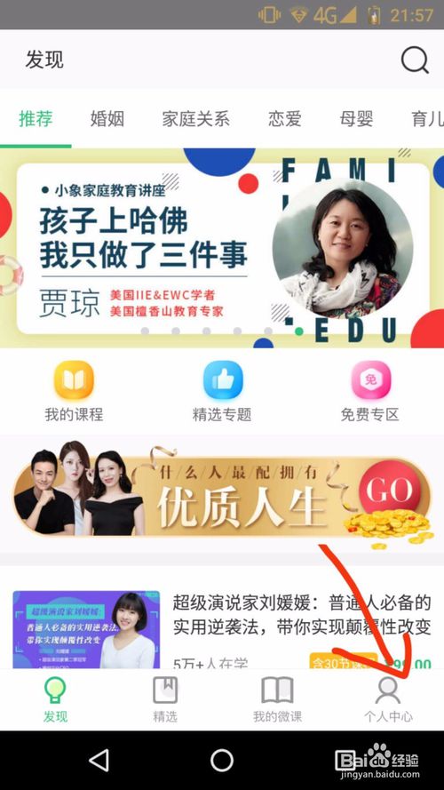 3、進(jìn)入"個(gè)人中心"頁(yè)面后,點(diǎn)擊中間的綠底欄的“成為講師”四個(gè)字。