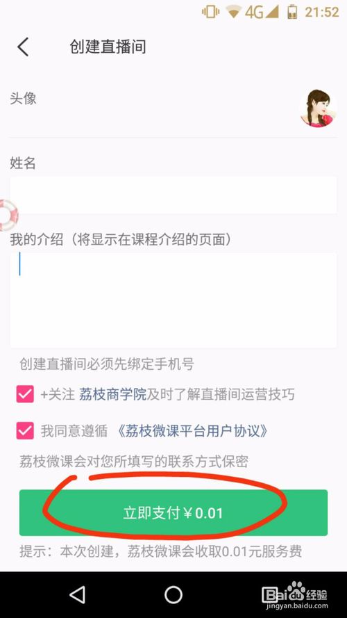 4、進(jìn)入"創(chuàng)建直播間"頁(yè)面,填寫姓名及課程介紹,支付0.01元成功,即可開通自己的專屬直播間。