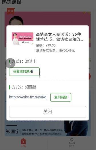 2、邀請(qǐng)卡頁(yè)面沒有提示“賺錢金額”,說明這節(jié)單課并沒有開啟分享功能。