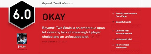 《超凡雙生》是一個野心勃勃的作品,但卻被匱乏的玩家選擇和分散的故事線拖了后腿。《超凡雙生》大部分場景都因為Ellen Page的杰出的演出而讓人印象深刻。但是,我還是第一次在游戲中有這么強(qiáng)烈的被動參與者的感覺,我的決定和行為在這個緊張而有深度的故事里影響極其細(xì)微?!冻搽p生》確實(shí)給我了一個難忘的體驗,但是作為游戲而言它并不優(yōu)秀。在通關(guān)后我更希望能看到游戲的電影版,那樣至少能節(jié)省8個半小時的時間。