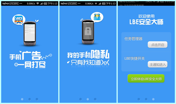 LBE安全大師大部分魅族M8和M9用戶都非常熟悉,去年年底魅族放棄為M8開發(fā)Android系統(tǒng)之后,LBE小組承擔(dān)起了為這款手機(jī)制作民間Android ROM的任務(wù),讓即將退市的M8迎來最后的升級(jí)。.后來的M9因?yàn)榉N種原因,拉面同學(xué)沒有為其進(jìn)行破解,而是帶領(lǐng)LBE小組轉(zhuǎn)向涉足到手機(jī)安全領(lǐng)域,于是就有了LBE隱私衛(wèi)士(現(xiàn)LBE安全大師的前身)。